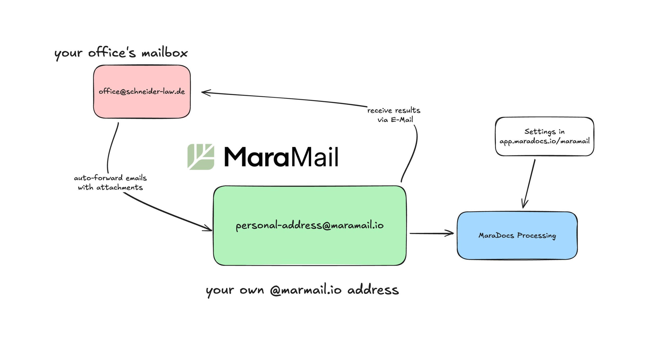 Ab sofort erhält jeder MaraDocs-Nutzer eine persönliche E-Mail-Adresse unter @maramail.io. Leiten Sie einfach E-Mails an diese Adresse weiter – und erhalten Sie die verarbeiteten Anhänge automatisch als optimierte PDFs zurück in Ihr Postfach.