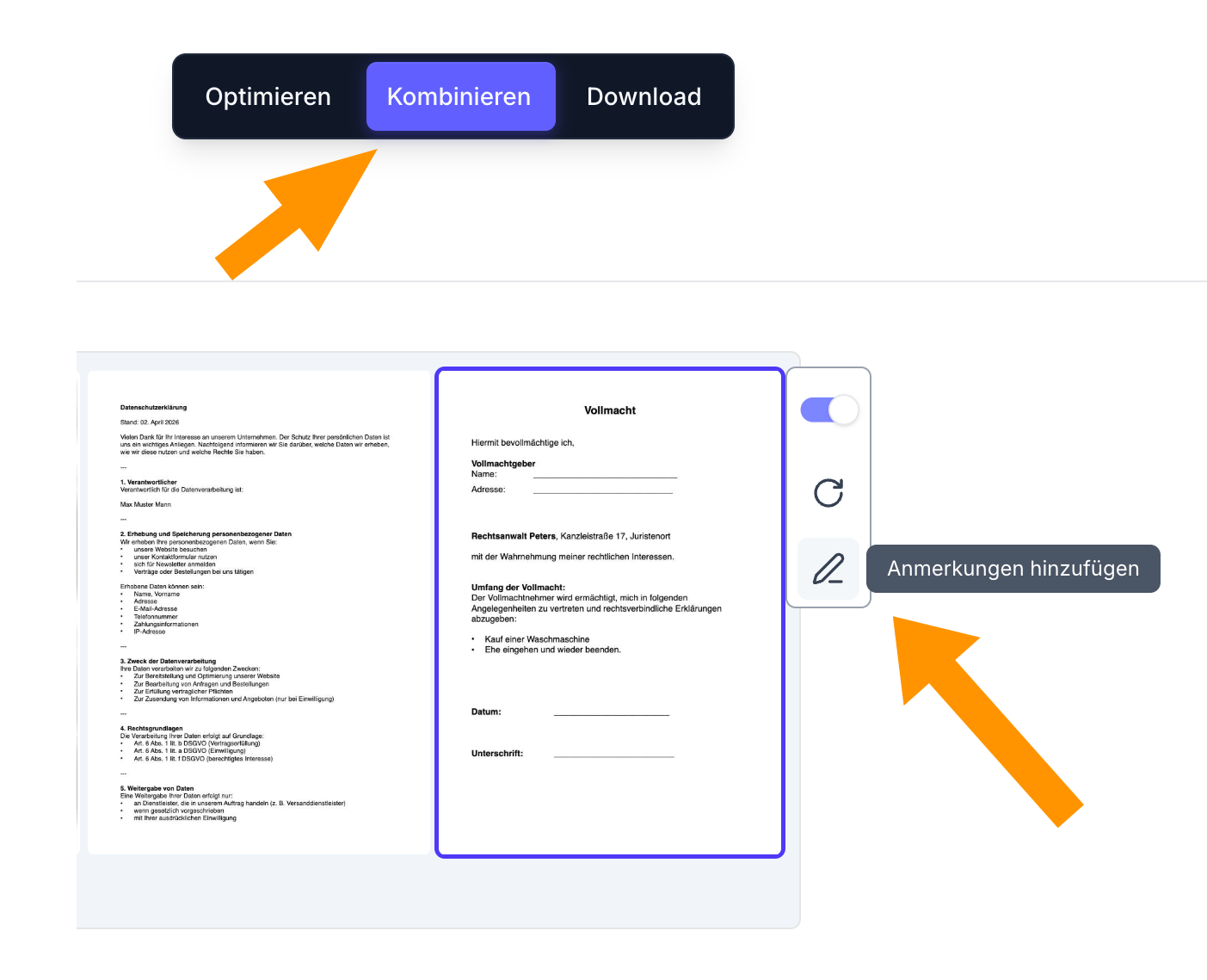Nella sezione Combinare dell'app cliccate semplicemente sul simbolo della matita su qualsiasi pagina PDF. Si aprirà quindi una sezione separata in cui potrete effettuare tutte le modifiche PDF senza complicazioni.