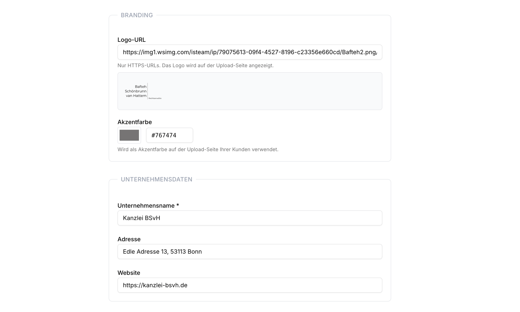 Quando i vostri clienti aprono il link di caricamento, vedono un'interfaccia personalizzata per il vostro studio. Anche tutte le e-mail di MaraDocs utilizzano il vostro logo, il vostro colore e il nome del vostro studio. La configurazione avviene nelle impostazioni sotto "Branding".