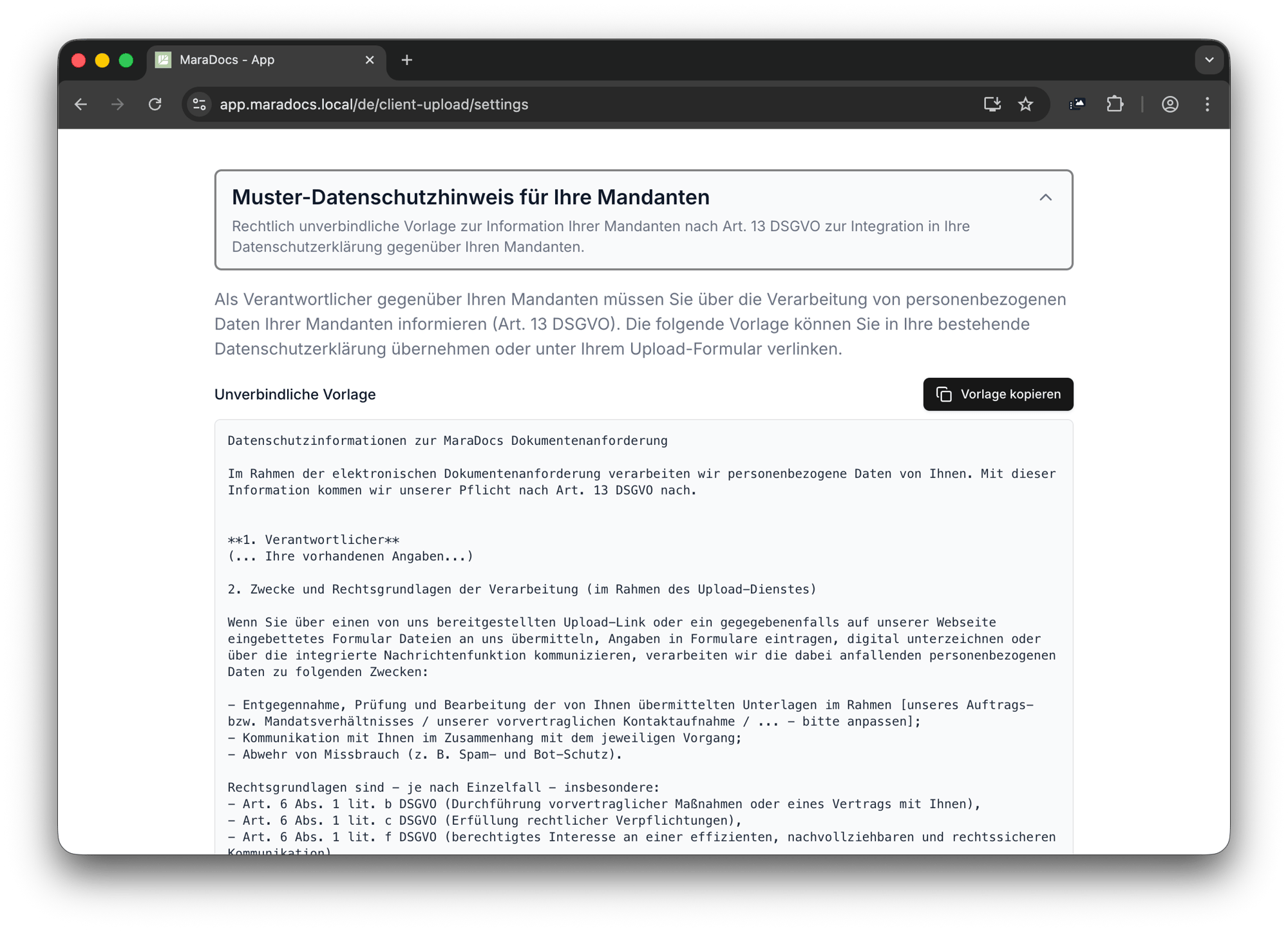 MaraDocs fornisce un modello standard tedesco ragionevole. Potete adattare il testo nelle impostazioni in qualsiasi momento, ad esempio allinearlo al contenuto della vostra informativa sulla privacy o gestire lingue aggiuntive.
