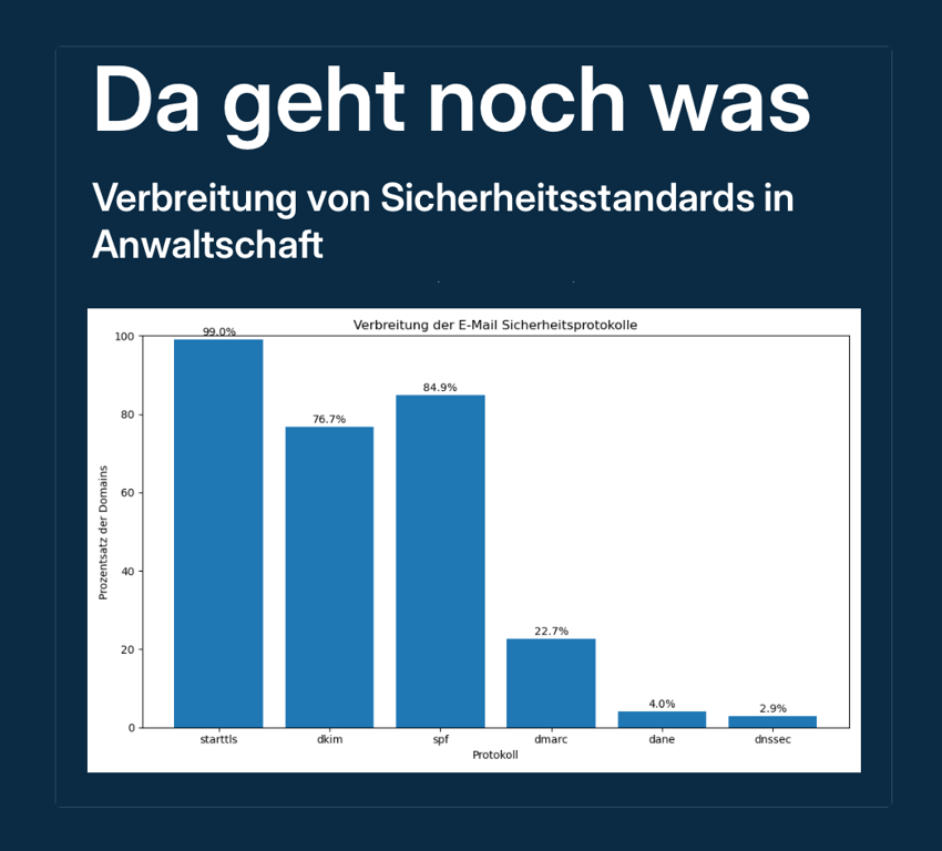 Weit abgeschlagen finden sich jedoch DANE und DNSSEC. Es gibt einige Anbieter, die diese Sicherheitsprotokolle bereits standardmäßig implementieren. Nutzt eine Kanzlei bzw. eine Anwältin oder Anwalt diesen Dienst direkt (also ohne eigene Domain), profitiert er oder sie unmittelbar davon.